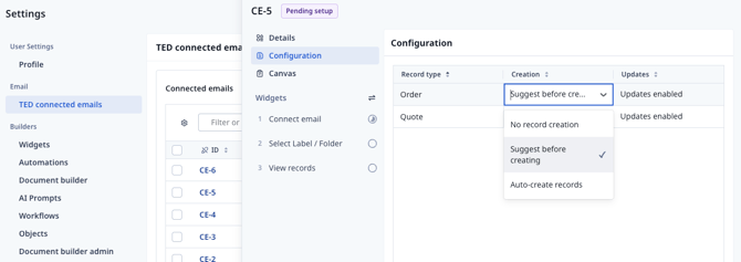 Toggle auto-approve OFF or ON per inbox connection by selecting "Suggest before creating" (auto-approve OFF) or "Auto-create records" (auto-approve ON)