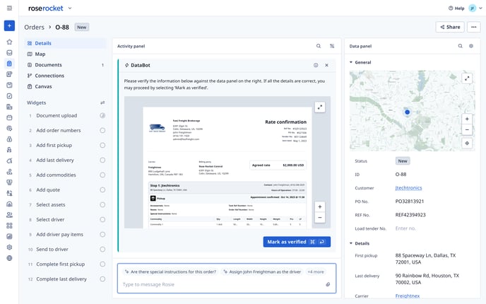 DataBot is an AI-powered order scanner that scans documents like rate confirmations and quote requests and turns them into orders in Rose Rocket. DataBot is well-loved for cutting down order entry time into seconds.