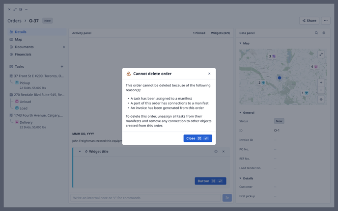 - Check for Assigned Tasks: The system automatically checks if any tasks related to this order are still assigned to manifests. The system won't let you delete the order until you remove the tasks, invoices and manifests from the order.